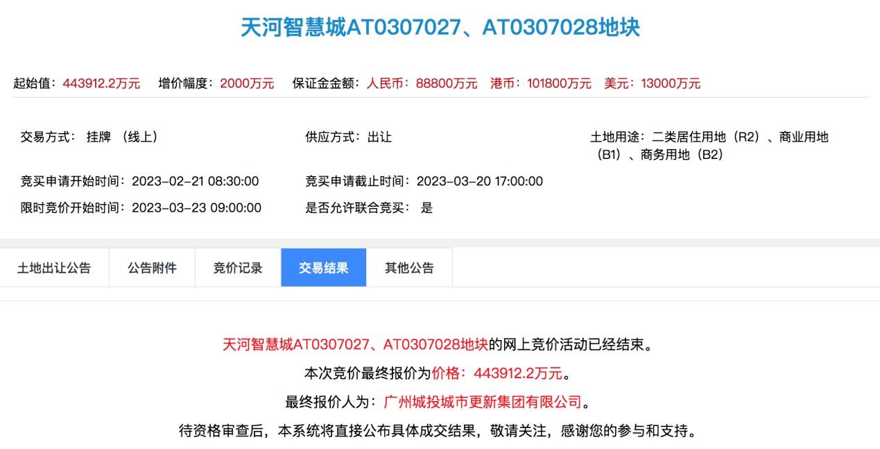 獲得天河智慧城地塊的企業是廣州城投城市更新集團有限公司,成交價格是44.39億元人民幣。另外一塊增城寧西街的地塊由增城城投旗下的增城區東進城市開發投資有限公司獲得,成交價格為19億元。