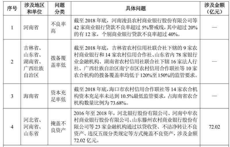 公告稱,目前多數(shù)金融機構(gòu)能夠加強金融風(fēng)險管控,但仍有包括河南、吉林、山東等7個地區(qū)在內(nèi)的部分地方性金融機構(gòu)存在不良貸款率高、撥備覆蓋率低、資本充足率低、掩蓋不良資產(chǎn)等問題。