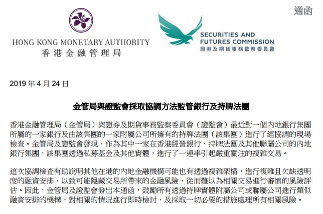 4月24日,香港金融管理局(香港金管局)發布《金管局與證監會采取協調方法監管銀行及持牌法團》公告,公告稱香港金管局與香港證監會(香港證券與期貨監察委員會)最近對一個內地銀行集團所屬的一家銀行及由該集團的一家附屬公司所擁有的持牌法團進行了現場檢查。香港金管局及香港證監會發現,這家在香港經營銀行、持牌法團及其他聯屬公司的內地銀行集團,進行了一連串引起值得嚴重關注的復雜交易。