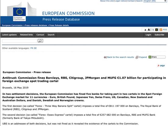 據(jù)英國(guó)《金融時(shí)報(bào)》、路透社等媒體報(bào)道,因串謀操縱11種貨幣匯率,互相交換商業(yè)敏感信息和交易計(jì)劃,歐盟對(duì)巴克萊、蘇格蘭皇家銀行、花旗集團(tuán)、摩根大通和三菱日聯(lián)金融集團(tuán)處以了10.7億歐元的罰款(約合人民幣84億元)。