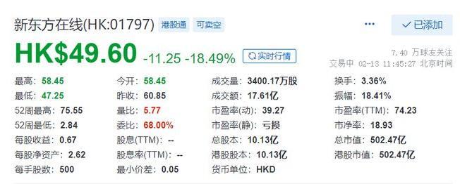 2月13日新東方在線在港股中繼續出現低開低走的態勢盤中的跌幅就達到了21%,目前每股暴跌51.75港元,下跌幅度達到了14.95%,目前新東方在線的市值為524億港元,此次新東方在線的股價下跌主要是由于新東方在線的執行董事,尹強對公司減持了100萬的股份,涉及到的資金就達到了6,159萬港元,尹
