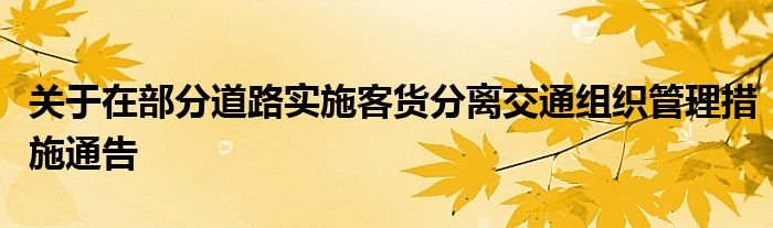 為規范道路交通秩序,進一步提高道路通行效率,緩解交通擁堵,根據《中華人民共和國道路交通安全法》第三十九條的規定,我局決定繼續在部分道路實施客貨分離交通組織管理措施,具體通告如下: