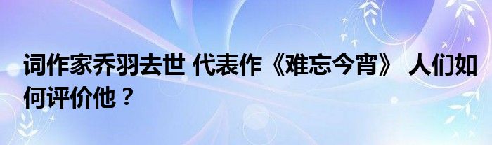 【詞作家喬羽去世 代表作《難忘今宵》】“難忘今宵,難忘今宵,不論天涯與海角,神州萬(wàn)里同懷抱,共祝愿祖國(guó)好 祖國(guó)好”相信這首歌曲很多人都不陌生,可以說(shuō)是陪伴著一代又一代人春晚的回憶。每年的春晚沒有難忘今宵好像就缺少了點(diǎn)什么,昨日其作詞者喬羽先生因病離世了。