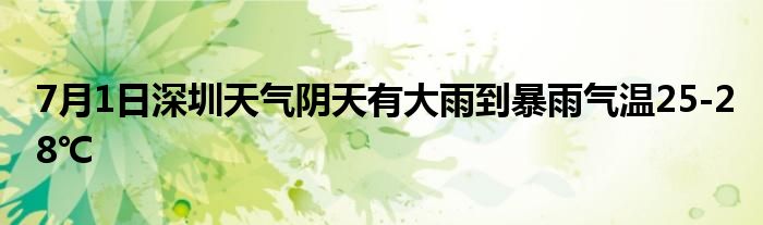 7月1日深圳天氣陰天,有大雨到暴雨;氣溫25-28℃;東風(fēng)5-6級(jí),沿海、高地和海區(qū)陣風(fēng)8-9級(jí);相對(duì)濕度60%-95%。