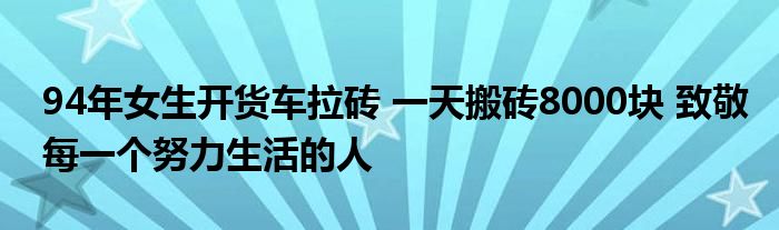【94年女生開貨車?yán)u 一天搬磚8000塊】近日,一名94年女生開貨車?yán)u一天搬8000塊:每天凌晨2點(diǎn)起床去裝磚。引得網(wǎng)民關(guān)注。