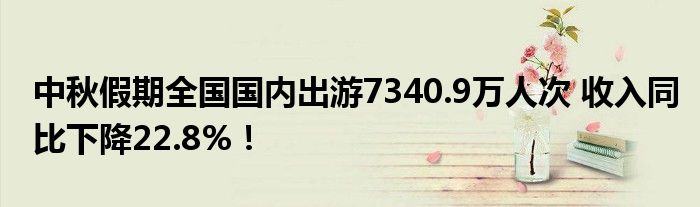 【中秋假期全國國內(nèi)出游7340.9萬人次】同比下降16.7%!經(jīng)文化和旅游部數(shù)據(jù)中心測算,今年中秋節(jié)假期全國國內(nèi)旅游出游7340.9萬人次。