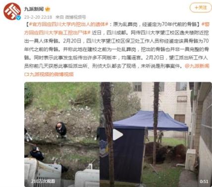 網(wǎng)傳在四川大學的小區(qū)內挖到了一具尸體,一時間引起了廣泛的關注和討論。川大望江校區(qū)保衛(wèi)處的工作人員稱,是在施工的時候挖到了一具人體骨骼,公安經過鑒定是70年代以前的了,事發(fā)地是學校的逸夫樓,離學生宿舍很遠,在這之前這一片是亂墳崗,并不是網(wǎng)傳的失蹤、被害等。