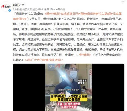 2月17號(hào)溫州發(fā)生了一起事故,一輛特斯拉不受控制,撞上公交車導(dǎo)致一死一傷。根據(jù)最新消息,特斯拉的駕駛員已經(jīng)蘇醒在3月1號(hào),蘇醒的特斯拉駕駛員委托自己家屬公開(kāi)回應(yīng)此事故。