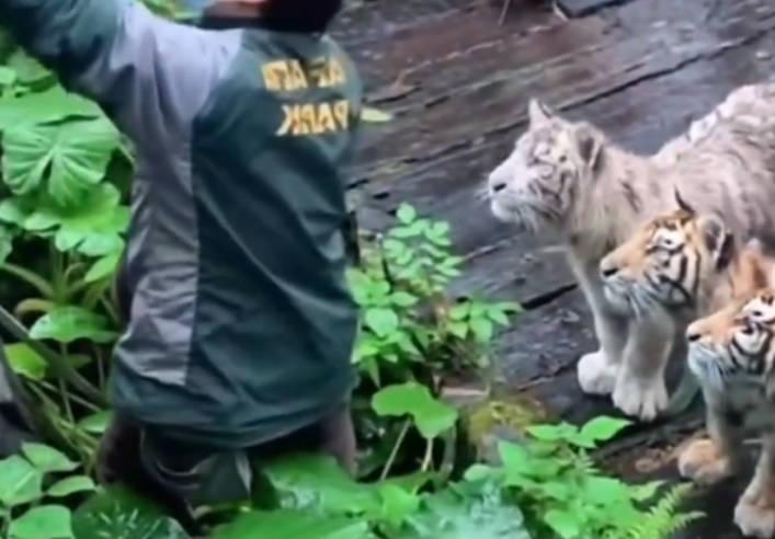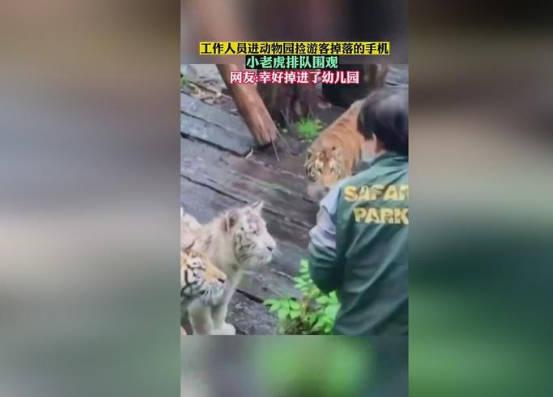 近日網絡上一則視頻引起了網友的關注,廣東一游客由于將手機意外掉入了虎園,工作人員幫忙拾取,結果引來幼虎的圍觀。視頻中顯示一開始有三只小老虎在一旁對工作人員進行上下打量,隨后又出現了一只老虎,四只老虎并排圍觀,工作人員畫面既搞笑又有些害怕。工作人員表示,幸好這四只老虎都是幼虎,年齡不大,還一次摸了這幾只小老虎,小老虎被摸了一下,似乎還挺享受。