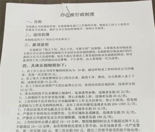 集團公司所流出的規章制度,顯示其中14條的樂捐細節,引起了眾多網友的關注。該公司規定員工超過早餐用餐時間就要樂捐20元,上班時間穿著合規也要樂捐20元,工作時間外出不過10~15分鐘的也會被進行嚴重警告,而且第2次將會被處以100元的樂捐處罰次數越多,罰款的金額也會越多,最高達到了500元每次。