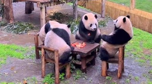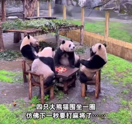 近一段時間大熊貓熱在全國蔓延,動物園都相繼迎來了大批前來觀看大熊貓的游客,今日重慶的一所動物園中4只大熊貓圍坐在一張桌子上進行著互動,也有可稱這4只大熊貓像不像在一起打麻將,這一現象被網友發布到了網上,迅速引起了廣大網友的關注,對此重慶當地動物園的工作人員稱,其實這4只大熊貓是在一起飼養的,經常可以看到4只大熊貓圍坐在一張桌子中進食的畫面,4只大熊貓分別是雙雙,重重,喜喜,慶慶是同一天出生的兩對雙胞胎,這4只大熊貓非常的喜歡坐在一起吃蘋果,而且每當飼養員將食物放在桌子上之后,4只大熊貓就會分別坐在椅子上慢慢的吃。