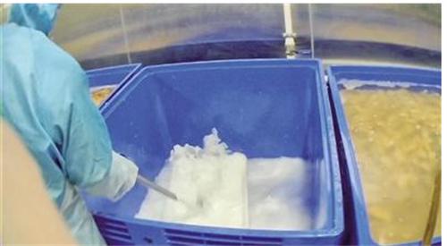該食品加工廠的工人將從國外進口的這種黃金鮑投入到車間的水池中,進行解凍之后加入白色的藥粉對其進行稀釋。隨著白色粉末在水池中不斷的攪拌清水變成了紅色,而黃金鮑會變得通體金黃,非常的好看。
