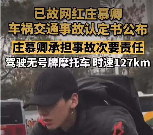 在2023年的1月5日晚上,重慶江北區聚賢巖隧道發生了一起摩托車相撞事故造成4人死亡,在4名死者中一名叫做莊慕卿的機車網紅也在其中,對于這起事故,網友每一直都持關注態度在3月14日莊慕卿的父親在社交平臺對此次的車禍交通事故認定書進行了發布,根據江北區交警支隊出具的事故認定顯示此次的事故16歲的少年丁某承擔其主要責任,21歲的莊慕卿承擔事故的次要責任,該事故的其他當事人不承擔任何責任。