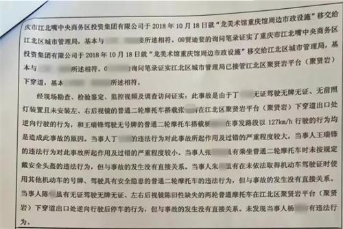 根據交警出具的認定書顯示經過,對現場的勘察和監控視頻顯示此次事故主要是由于丁某無證駕駛無牌無照摩托車在江北區聚賢巖平臺隧道出口處逆行所造成的事故,丁某所駕駛的車輛并沒有安裝前照燈和左右后視鏡,莊慕卿所駕駛的普通二輪摩托車搭載楊某在事發路段的時速達到了127公里每小時也是造成此次事故的主要原因。