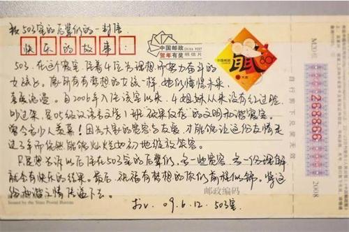 這名學(xué)姐在2009年留下的這張明信片,雖然說已經(jīng)泛黃但是仍然完好無缺,正如這位學(xué)姐在明信片中所寫到的,希望主在503寢室的后輩們多一些寬容,多一份理解就會(huì)有快樂和結(jié)果,在14年后的今天503寢室住著祖英,紫璇,茜茜和娟娟這4名女生依舊保持著團(tuán)結(jié)友愛向善向上,開朗浪漫的性格。