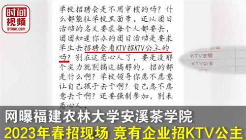 本年度各大學(xué)院的春招已經(jīng)開始,在福建農(nóng)林大學(xué)的校園招聘會上卻驚現(xiàn)酒店KTV公主這一職業(yè),眾所周知酒店公主KTV一直都是一種不是特別正當(dāng)?shù)男袠I(yè),在許多的酒店當(dāng)中都有著隱晦的職業(yè)存在,在如今的春招會議當(dāng)中卻出現(xiàn)了本次的崗位,這也讓許多人都為之感到憤怒。因為大學(xué)是一種培育人才的地方,不應(yīng)該出現(xiàn)如此低俗且惡劣的崗位存在,這也在網(wǎng)上引發(fā)了積微熱烈的討論。