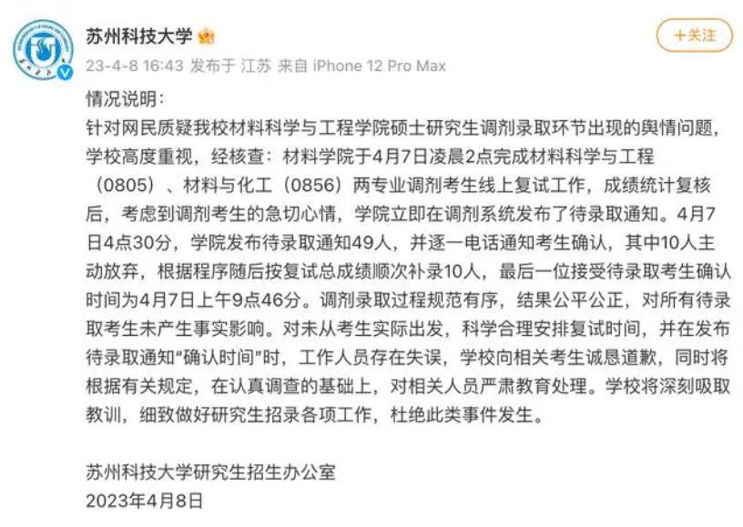 蘇州科技大學官方的微博對此也發表了聲明,稱這一次錄取通知對于考生實際錄取情況并沒有造成影響,工作人員在發布確認時間時出現了一些錯誤,使得這一通知在凌晨時間對學生發出也需要設計這件事情的考生表示道歉,并承認對于復試時間要合理的作出安排,防止這樣類似的事件再度發生。
