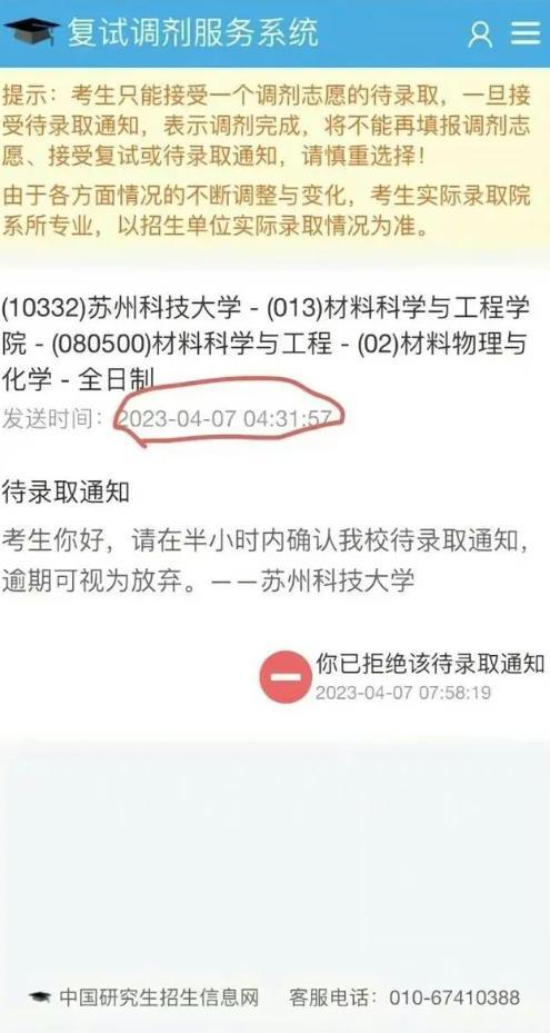 蘇州大學核查之后,材料與化工和材料科學與工程這兩個專業,4月7日凌晨2點完成了考生的調劑和線上復試等一系列工作,調劑系統當中也發布了等待錄取的通知,并且向考生逐一的打電話確認錄取情況,49人中有10人主動放棄了學校錄取,再根據復試的成績依次補錄了10名學生,而最后一個接受待錄取通知的學生,是在4月7日上午9:46確認的。