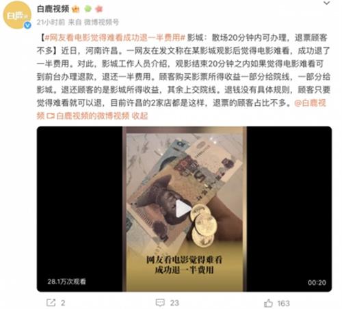 “電影難看,退一半錢”,這件事情確實讓人覺得較為驚奇,當前一些購票的平臺或者影院購買票之后,就不支持退簽和改簽了,或者只能夠去改簽其他場次的票是不能夠退票的,或者將用戶每月退票的次數有一定的限制,所以當用戶將電票買錯了,亦或者有急事臨時無法觀看電影票,就只能夠選擇自己把票轉手或者自認倒霉,所以就算影片再難看,也只能夠自己去把影片看完。