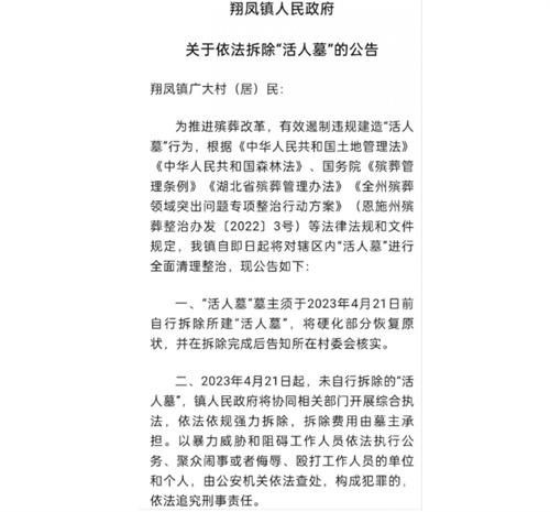 4月11日,湖北恩施州來鳳縣翔鳳鎮政府發布了有關于拆除“活人墓”的公告,該公告中表示未自行拆除的活人墓將會依照相關法規強拆,據媒體采訪該地相關工作人員表示,來鳳縣當下正在推進殯葬改革的主體工作,拆除活人墓是該項工作的重點推進任務,將會從2023年4月21日開始對未自行拆除的活人墓實施依法強力拆除措施,對違規阻攔拆除的相關人員和機構將依法查處。