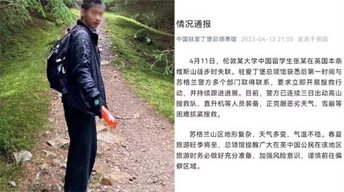 4月11日,倫敦某大學的中國留學生張某在英國本奈維斯山徒步旅行時失聯,當下我國駐愛丁堡總領館已經在第一時間與蘇格蘭警方等多個部門取得聯系,當地警方已經連續三日出動高山搜救隊和直升機等救援設備,正克服一系列惡劣天氣和雪崩困難抓緊搜救失聯者。