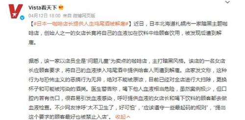 根據(jù)日本媒體4月12號報道,日本北海道札幌市有一家主打暗黑風(fēng)格的咖啡館,咖啡店的女店長在上班期間根據(jù)顧客的要求,將自己的血液滴入正在調(diào)制的雞尾酒里面提供給客人使用,被發(fā)現(xiàn)后該名女店長遭到解雇。