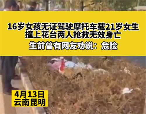 有知情者表示事發地點是在云南省昆明市晉寧區某一地段,騎車的兩個女孩都是00后,其中最小的16歲最大的21歲都非常喜歡騎摩托車,其中有一個女孩借了別人的摩托車帶著自己的閨蜜騎車,由于駕馭不了這輛摩托車的性能速度過快,最終引發了事故。