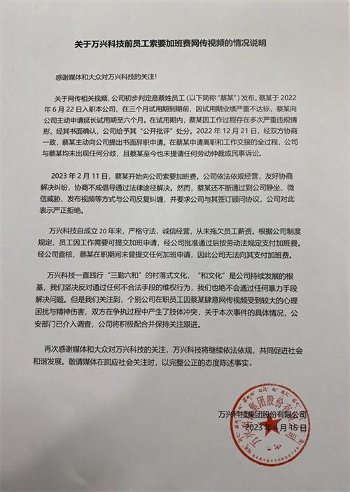 萬興科技也就此次事件做出回應,稱從未拖欠過員工薪資,根據公司的制度規定,員工可以提交加班申請,經過公司批準之后將按照相關規定支付加班費,但經過公司的核查這名員工在職期間并沒有提交過任何的加班申請,因此無法支付加班費,目前公安部門已經接受調查,等待最終的結果。