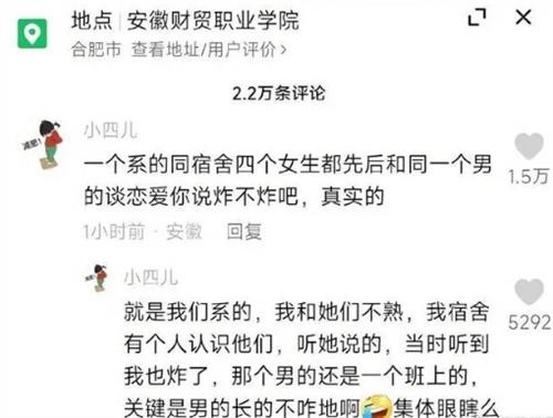 4月17日傍晚,安徽財貿職業學院的多名學生聚集在1棟男生宿舍樓斥責住在此宿舍樓當中的一名男生,斥責該男生同時交往多名女生,是名副其實的渣男。