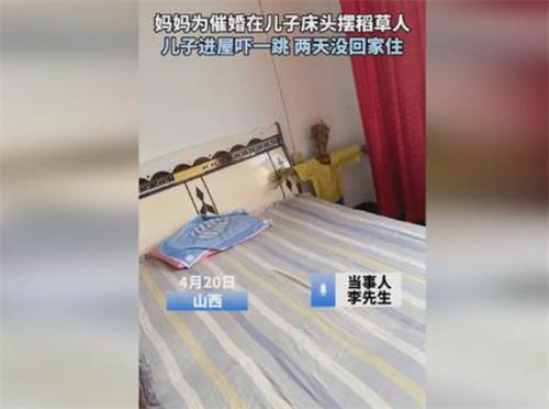 4月20日,一名來自于山東運城的網(wǎng)友在網(wǎng)上發(fā)帖曬出了自己的遭遇,據(jù)該名網(wǎng)友所述,他的媽媽為了催婚在他的床頭擺放了一個稻草人,當天晚上這位網(wǎng)友,回家的時候直接被床頭的這一幕嚇了一跳,事情發(fā)生之后,該網(wǎng)友的母親在網(wǎng)上回應(yīng)稱,孩子害怕就對了,說明這樣做還是管用的。