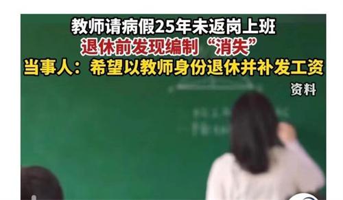 姚志榮作為一名教師在2020年將迎來(lái)退休,卻發(fā)現(xiàn)教師編制”消失“了。姚志榮于1983年從齊齊哈爾師范學(xué)院體育系畢業(yè),被分配到第十二中學(xué),作為一名老師。工作14年之后,因?yàn)閭€(gè)人身體原因到北京治療,一直并沒(méi)返回工作單位。2022年姚志榮的工資停發(fā),之前咨詢財(cái)務(wù),財(cái)務(wù)回應(yīng)因未休病假規(guī)定不能發(fā)工資。姚志榮請(qǐng)病假的25年期間沒(méi)有任何教學(xué)行為,導(dǎo)致教師編制消失。