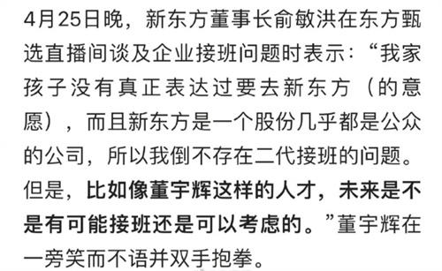 近期在新東方的直播間當(dāng)中有一些網(wǎng)友發(fā)表了言論,詢問俞敏洪接下來對于接班人是如何考慮的,對此俞敏洪也是做出了表態(tài),將自己內(nèi)心的想法在直播間當(dāng)中跟大家進行袒露,在直播間當(dāng)中就說明了自己的兒子并沒有接手新東方的想法,自己也不會將這些事業(yè)一并的交付到自己兒子手上,若是他自己不想接手的話即便是強迫也沒有用,自己目前是有一個合適的接班人選就是董宇輝,董宇輝是不可多得的人才,在各方面都能夠完成的很好,也對新東方這個產(chǎn)業(yè)有很深的了解,讓他來接手或許是最合適的。