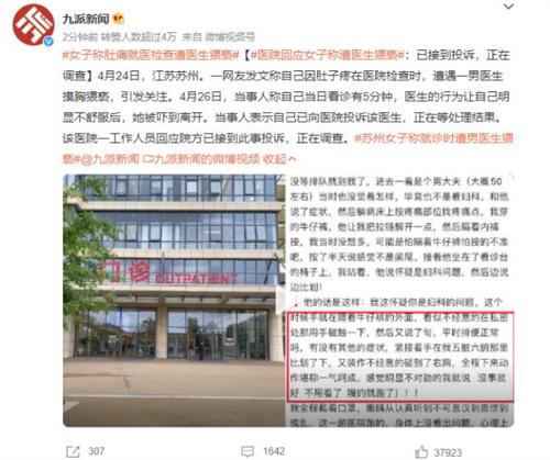 4月24日,江蘇蘇州一名網友發文稱,自己在醫院做檢查時遭遇一名男醫生摸胸猥褻,這名網友稱,自己在當天由于肚子疼便前往一家醫院做檢查,在看診的過程中,值班男醫生看似不經意間觸碰自己的私密部位,而后又裝作不經意碰到了自己的右胸,全部動作一氣呵成,自己在當時被醫生的動作嚇到了,于是便直接離開醫院沒有做后續的檢查。