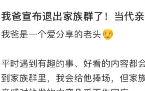 最近有媒體評因分享無人回應爸爸退出家庭群,這位退群的爸爸稱自己加入了家庭群之后,經(jīng)常在里面分享一些內(nèi)容,不過卻經(jīng)常受大家的無視,表示覺得很尷尬,她認為家庭群就是自己的一些親戚可以在里面聊天,分享自己喜歡的內(nèi)容或者是不開心的事情,既然經(jīng)常分享東西,沒有人回應,干脆就退群了。