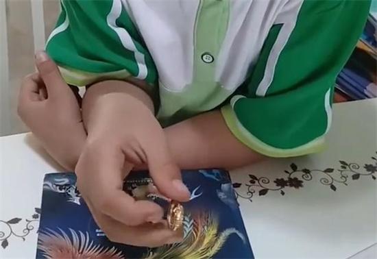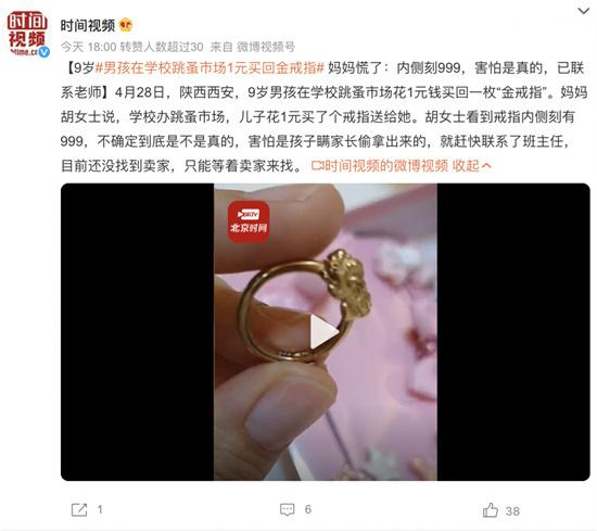 陜西西安一名九歲男孩在學校的跳蚤市場上花一元錢給媽媽買,回了一個金戒指,金戒指的內側刻有999的標志,媽媽看到后很擔心。