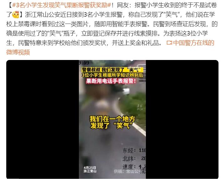 近日,浙江有3名小學(xué)生在放學(xué)后前往河邊玩耍,偶然間發(fā)現(xiàn)江邊有很多奇怪的金屬瓶子,看到這些金屬瓶子讓他們聯(lián)想到先前禁毒課中警察叔叔展示出來(lái)的一些毒品照片,發(fā)覺(jué)這些瓶子像是圖片中描述的笑氣,于是這些小朋友當(dāng)即使用電話(huà)手表向警方報(bào)警,警方趕到現(xiàn)場(chǎng)之后發(fā)現(xiàn),這些瓶子確實(shí)是使用過(guò)的笑氣瓶子,隨后便對(duì)這些瓶子進(jìn)行了登記保存,并專(zhuān)門(mén)到四名小學(xué)生的學(xué)校頒發(fā)獎(jiǎng)狀,以此來(lái)表?yè)P(yáng)這些小學(xué)生。