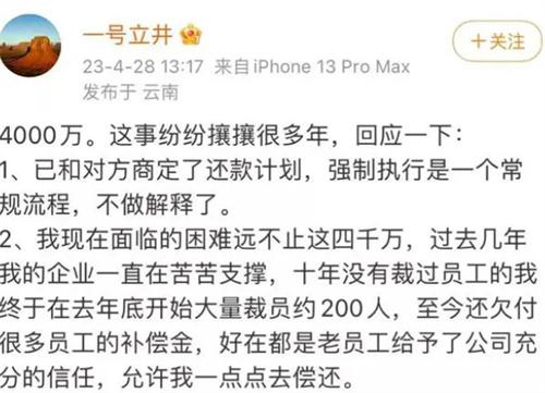 李亞鵬也針對于網絡上成為老賴的事情做出了回應,他表示欠債還錢天經地義,我也要為我自己的錯誤買單,這沒有任何異議,雖然現在還沒有償還4,000萬的欠款,不過已經和對方商定了之后的還款計劃,李亞鵬還透露他所面臨的財務危機,遠遠不止網友看到的這些,去年年底的時候公司裁員人數已經達到了200多人,到現在為止公司還拖欠了很多員工的賠償金沒有結付完畢。