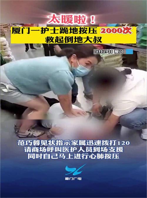 事發當時范巧蓉并沒有任何猶豫,一個箭步就沖了過去,對著手足無措的家屬喊道:“我是護士”,隨后將暈倒在地的大叔翻了過來,只見大叔臉部青紫,呼吸已經相當困難,意識也喪失了,她讓家屬撥打120,喊商場的醫護人員到場支援,自己立即進行心肺按壓,直到120救護人員到來,范巧蓉獨自按壓了將近20分鐘,中途幾乎精疲力盡,但她仍然堅持,在昏迷大叔被120接走之后,范巧蓉累成一攤泥,在商場休息了好久才有力氣開車回家。