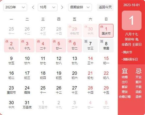 據日歷顯示,2023年9月29日為中秋節,10月1日為國慶節,中秋遇上國慶,相關政策表示,中秋節前不調休,節后連放八天假,八天假過后打工人需連上七天。