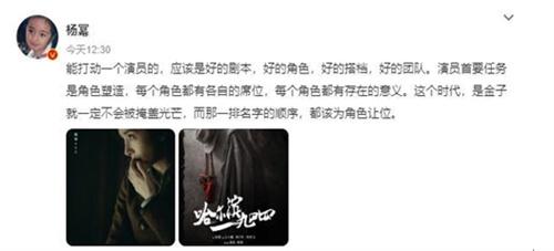 北京時間5月10日,楊冪和秦昊主演的新劇哈爾濱1994正式發(fā)布陣容海報,隨后楊冪在個人社交媒體平臺上發(fā)文,稱到演員的名字順序就應(yīng)該為角色讓位,畢竟演員的主要任務(wù)是角色塑造。