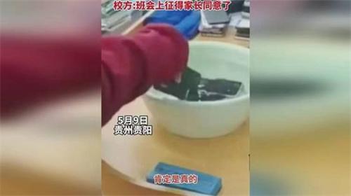 事發之后有學校的工作人員回應:學校對于學生的管理比較嚴格,將手機泡水處置征得家長的同意。家長也非常贊同這種做法,認為即使在學生當面摔了手機也可以,校方考慮到摔手機的影響不是很好,所以最終選擇將手機泡水處置。