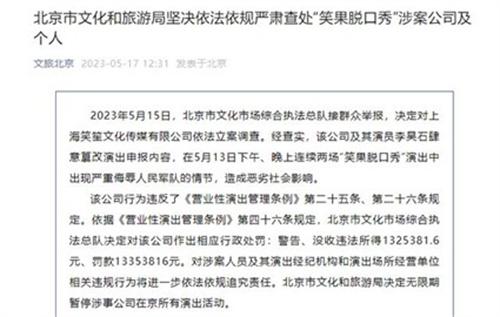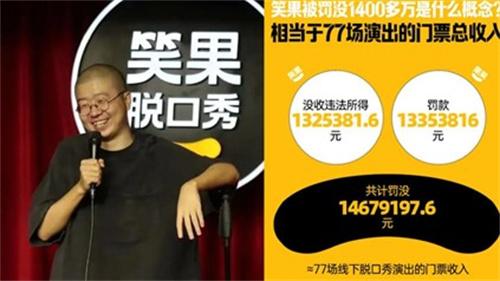 近期在互聯網上,很多人都被笑果文化傳媒有限公司的一脫口秀演員在進行演出時,因言辭不當使用了侮辱人民子弟兵的言語而刷屏,這名脫口秀演員的言語更是已經造成了極其嚴重的社會影響,甘明脫口秀演員所屬公司也被進行了立案調查,今日的中午,北京文化和旅游局針對笑果文化傳媒有限公司的處理結果進行了通告,在通告中顯示對效果文化傳媒有限公司作出對應的行政處罰,對笑果文化傳媒有限公司進行警告并沒收其演出收入1325381.6元,對效果文化傳媒有限公司罰13353816元,其罰款總數為1467.9萬元,由于該起案件中涉案人員,演出機構以及演出單位都出現了違規違法行為,在下一步也將會追究其違法行為,針對效果公司將會無限期的停止該公司在北京的演出活動。