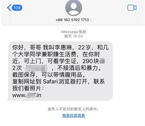 這段時間有很多朋友們紛紛向媒體反映稱自己使用的蘋果手機總會接到一些奇奇怪怪的信息,而且這些信息的內容基本上全部已經涉黃,有一名朋友更是將自己的信息內容向媒體進行了公開,在信息內容上講述自己是一名正在讀大學的在校學生,需要靠兼職來賺取一些收入,兼職工作就是為人提供色情服務,隨后還有一條鏈接出現在文字內容的下方,收到這條信息,如果想要和自己聯系的話,只需要將鏈接復制到手機瀏覽器上,就可直接查看自己的聯系方式。