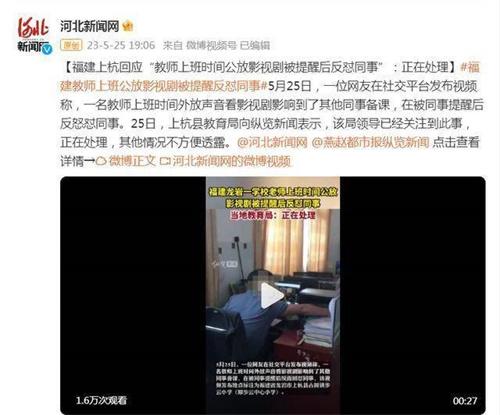 2023年5月25日,根據(jù)燕趙都市報(bào)的報(bào)道,一位網(wǎng)友在社交平臺(tái)當(dāng)中發(fā)布視頻,稱一名教師在上班的時(shí)間,用電腦外放聲音來(lái)觀看影視劇,嚴(yán)重的影響了其他同事在辦公室去進(jìn)行備課,而在這位教師被同事提醒之后,并反對(duì)同事。25日上杭縣教育局也向媒體表示該局的領(lǐng)導(dǎo)已經(jīng)關(guān)注到此事,正在處理,目前的情況不方便透露。