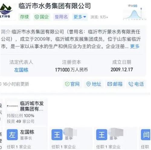 臨沂市紀委工作人員也向記者表示,這件事情的詳細過程暫時并不太清楚,如果有屬實的線索可以直接舉報。根據天眼查發現臨沂市水務集團的法定代表人確實是左國棟,顯示公司的總注冊資本是171000萬人民幣,注冊的日期是2009年的12月17號。