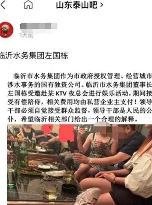 根據網上爆料的帖子以及披露的截圖顯示擔任臨沂水務集團董事長左國棟,受某私營企業之邀趕赴到某KTV夜總會,在集體活動期間接受了有償陪侍,在文中還表示臨沂市水務集團是作為市政府直接授權管理的公司,還是經營城市涉水事務的國有獨資公司,左國棟在夜總會期間的所有娛樂活動費用都是由私營企業全權支付,左國棟作為領導干部必須擁有自覺接受群眾監督的覺悟,領導干部也是人民的公仆,網友也希望臨沂市的相關部門能夠針對于左國棟的行為給出一個合理的解釋,從網友的配圖中可以看到,確實有幾名陪酒女子坐在了一名男子身邊。