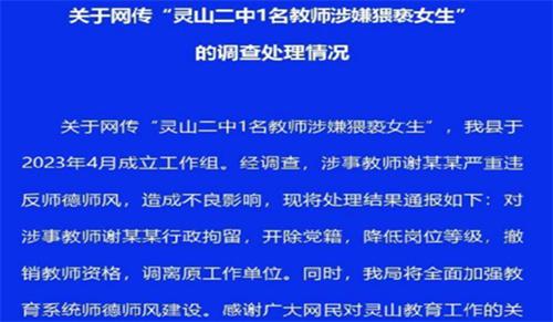 北京時間5月26號廣西靈山發布了關于網傳靈山二中一名教師涉嫌猥褻女生的詳細調查結果,根據調查情況披露,網傳靈山二中一名教師涉嫌猥褻女生事件發生之后,靈山縣就在2023年的4月份針對于該事件成立了詳細的工作調查組,經過調查組調查此事確實屬實。涉事教師謝某某確實嚴重違反師德師風,造成了不良影響,現在將處理結果正式公布,對于涉嫌猥褻教師謝某某處以行政拘留的處罰,并且降低崗位等級,開除黨籍,撤銷謝某某擁有的教師資格證,調離謝某某原工作單位,我縣教育局也將會在之后的工作中全面加強教育系統師德師風建設,同時也感謝廣大網友對于靈山教育方面的工作支持以及工作關系。