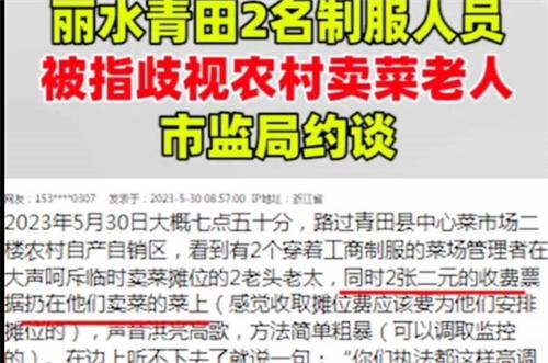 打造一個和諧文明的社會,需要所有人的共同努力,應該真正做到以人為本,努力提升農村老百姓來城市里賣菜的幸福感。在6月2日,青田縣市場監督局對此稱,經過核實以后,會著重的對兩名人員進行批評和通報,并且對上報的網友表示支持,也非常希望大家能夠共同營造一個和諧文明的社會,這樣才能夠使市場的管理更加純屬,對于管理者會更加著重培訓,努力提升,不會讓任何一個農村老百姓在城市里感覺到有屈辱感,也不會放過任何一個違法亂紀的公民。