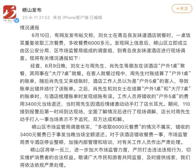 在6月10日這一天,有網友在自己的社交媒體上發布了一條帖子,這條帖子上講述自己在青島糧油味道酒店吃飯的時候,被酒店的工作人員重復收取了三次費用,最多一次收費高達6000多元,嶗山區在網上發現這一消息之后,也立刻針對這一消息組成了調查組針對青島糧味酒店進行了調查,經過調查之后,也立刻將具體情況對外進行了通報。