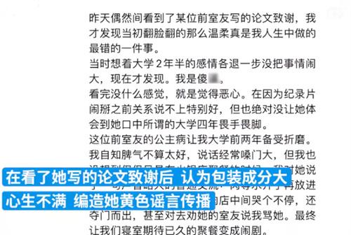 據(jù)了解,此次事件中造黃謠的是這位大四女生的前室友,她在宿舍聚餐的時候被石油臭罵了一頓,接受不了對方的辱便當場哭了起來,誰料后來的事情越來越魔幻,前室友專門寫了一篇文章編排這位女生,因為這位女生的性格非常老實,是一個悶葫蘆般的性格,并沒有對室友的行為做出反抗,從而使得前室友變得越來越囂張跋扈。